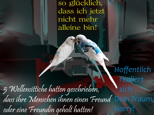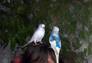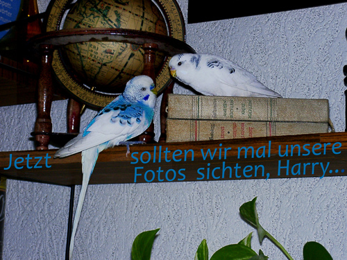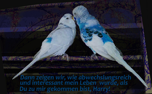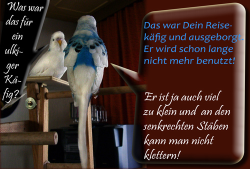 Noch schlimmer wurde es, wenn wir die Wohnung verließen. – Konnte unser Vögelchen in unserer Anwesenheit in der ganzen Wohnung herumfliegen oder sich einfach spazierentragen lassen (indem er auf dem Kopf, den Armen oder sonst wo saß), so haben wir ihn in seinen Käfig GESPERRT, weil es uns trotz des Ausschaltens aller Gefahrenquellen zu gefährlich erschien, ihn stundenlang ohne Aufsicht zu lassen! – Unterwegs machten wir uns dann schon Gedanken, was das arme Vögelchen so ganz alleine in seinem Käfig machte....